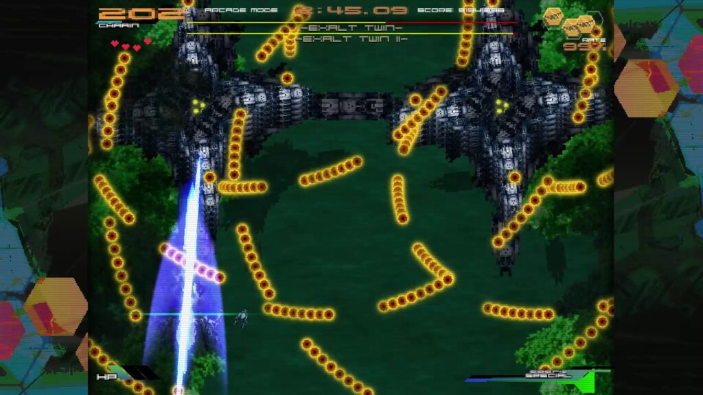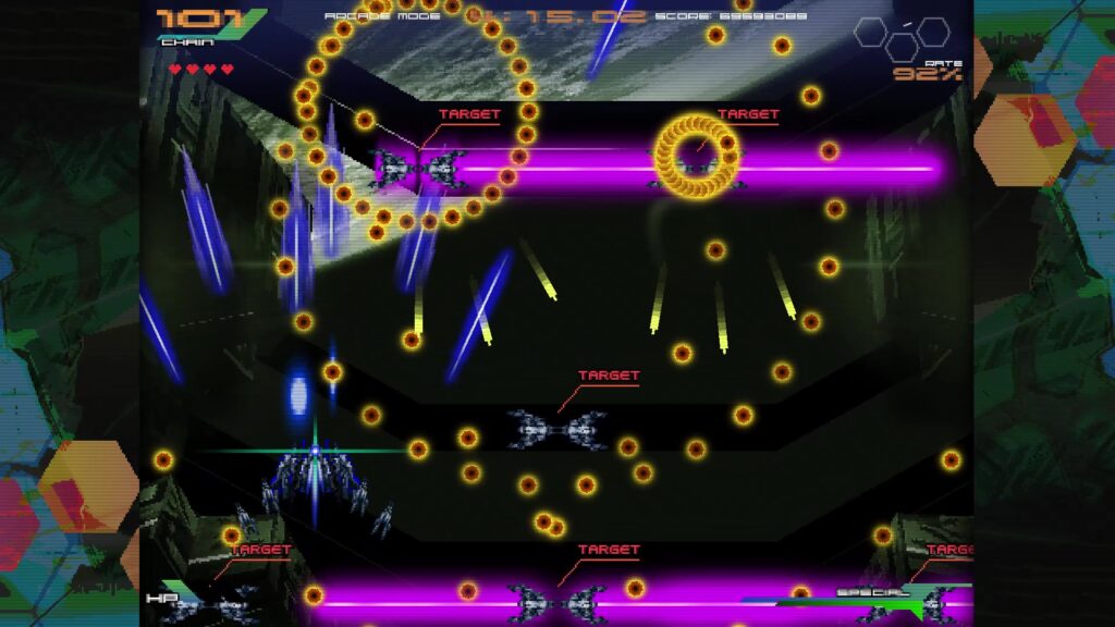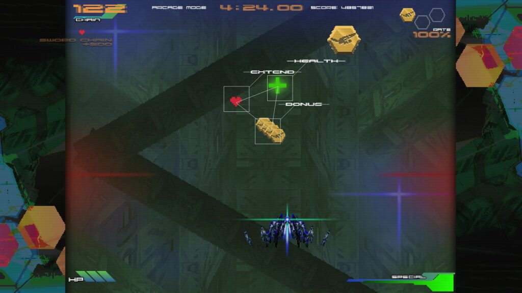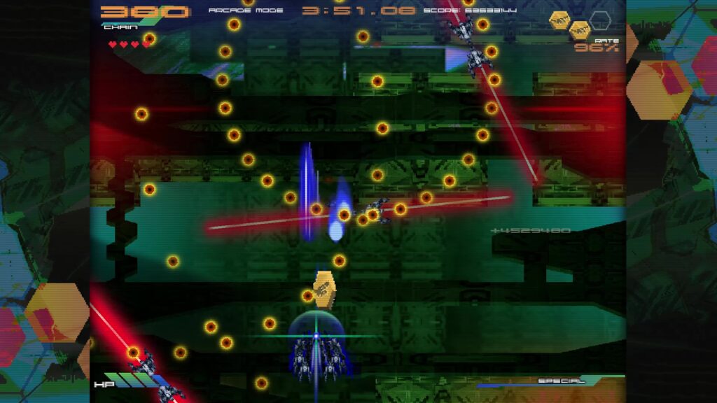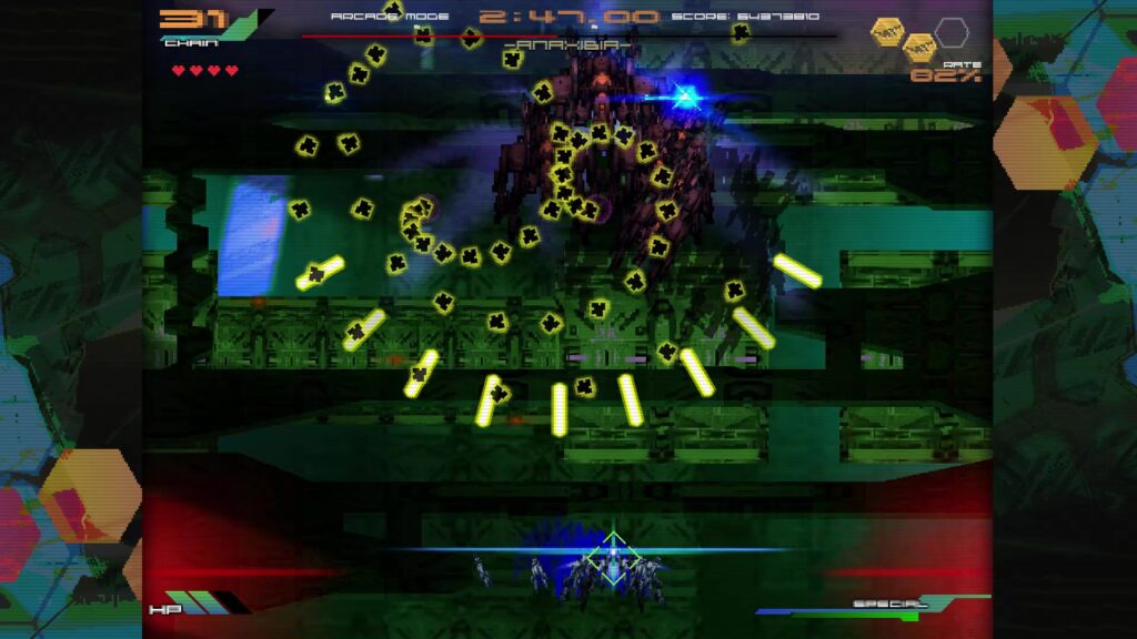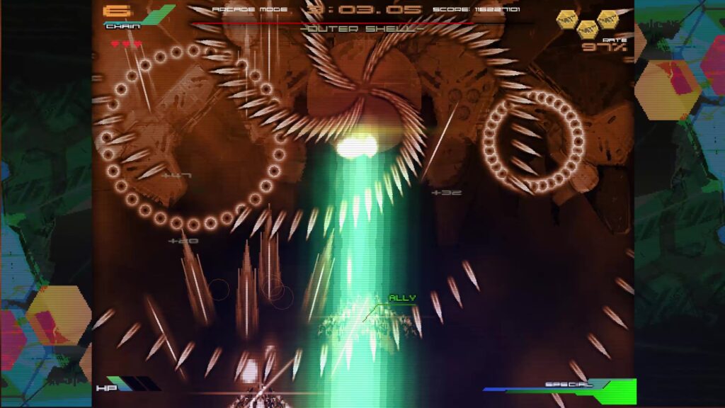 90年代アーケードSTGに影響を受けたと公言する作品。SFチックで退廃的な世界観、剣を操る自機、凝った演出を見て既視感を感じた人間もいるだろう。とはいえ元ネタになっただろう某銀色の銃とはSTGとしての作風はかなり異なり自機を使いこなせるようになるまで長時間かかる・・とかはなく、意外と大雑把に遊べる。初見殺しは結構多いし弾除けもキツいが、エクステンドのゴリ押しが十分通用するため、実際の難易度は非現実的というわけではない。前述のウェーブ制じみた構成も詰みに近い状況が頻発する事を防止している。