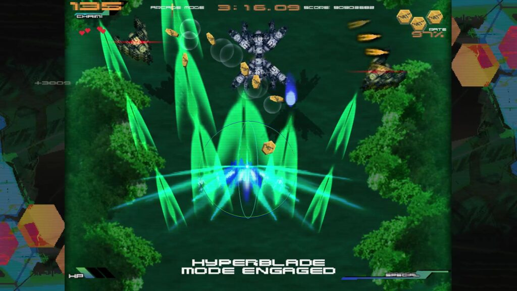 派手なショット、敵弾を消したりホーミング機能持ちの飛び道具にもできる剣、高火力+無敵+弾消しとわかりやすく強い必殺のハイパーブレードモードと強そうに見えるが、それぞれを細かく見ると決して万能兵器ではない。
